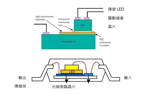 直接堆疊在硅襯底上的發(fā)光二極管(LED)芯片封裝技術(shù)可以實(shí)現(xiàn)更高的集成度和最薄的單芯片封裝。圖4顯示了兩個(gè)高速光耦 其中一條封閉通道的橫截面。輸入邏輯信號控制互補(bǔ)金屬氧化物半導(dǎo)體(CMOS)led驅(qū)動(dòng)緩沖芯片以提供led電流。光電探測器芯片由兩層透明層組成,分別是二氧化硅(SiO2)鈍化層或絕緣層和透明多晶硅?聚酰亞胺(PI)層和LED通過透明連接層粘附到光電探測器芯片。所有步驟均使用標(biāo)準(zhǔn)切屑粘附程序完成。